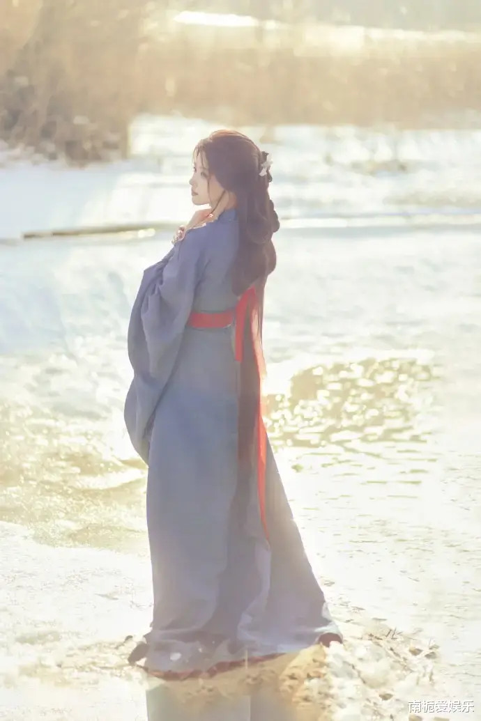 此次写真的创作背景选在山西吕梁故城遗址与深山雪岭之间,烟雨斑驳的古城墙、残雪覆岸的古渡口、暮色苍茫的芦苇荡,每一帧画面都如诗如画。卢昱晓身着复刻战国时期楚墓出土丝织品的宽袖长袍,交领右衽、墨绿织锦腰封刻有篆纹,红绳束发,摒弃繁复头饰,仅以一支玉簪点缀,还原出先秦服饰独有的质朴与庄重。蓝衣沾雪、宽袖随风,仿佛能听见历史的风声在耳边低语。